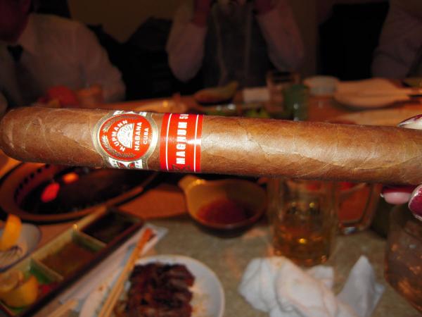 食事会が終盤に差し掛かると、シガーが配られる。面倒臭いから、どこかのシガーバーに移動することなく、焼肉屋店内で吸ってしまうのだ。本日の一本は、「H.アップマン マグナム50」。外観はスーパーロブスト、結構な迫力だ。
