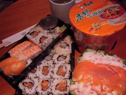 夕食はスーパーで寿司を買い込んで、ホテルの部屋で済ませる。しかし、高い割りに、寿司がまずい。それでも北欧に来てはじめて米粒が食べられて、とても嬉しかった。