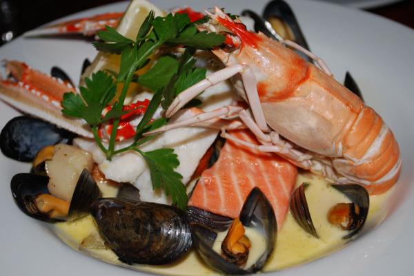●季節の魚貝のフリカッセ(フレンチ風煮込み)と蒸しザリガニのシャンパンクリームソース仕立て、野菜とグリル帆立貝添え