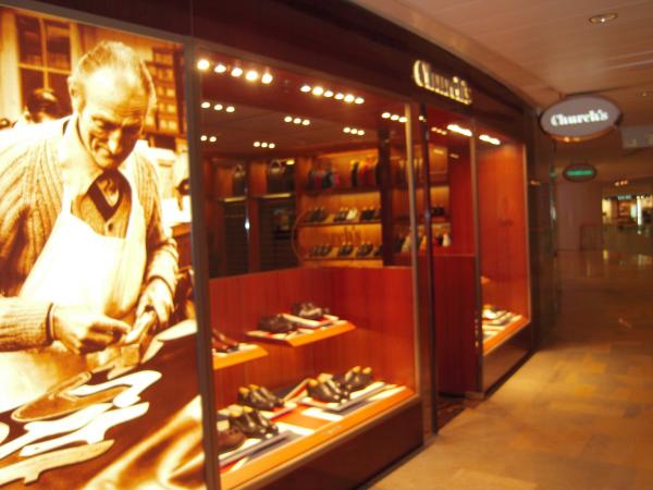 続いて、靴屋の「チャーチ(英Church’s)」で靴を一足購入、一足修理。履いている靴は、11年前に同じチャーチの香港店で購入。ボロボロになったが、それをイギリス本店に送って修理・再生してくれるという。