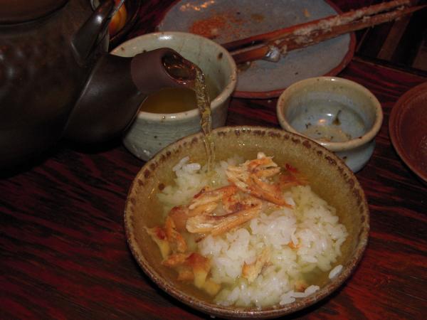 そして、最後、使用済みの魚を捨てるのがもったいなく、私はある食し方を考案した。魚の身をほぐして、熱々のご飯のうえにパラパラとやって、最後にそれもまた熱々のお茶を注ぎ、はい、出来上がり――、名付けて「酔っ払い岩魚茶漬け」。