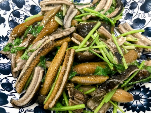 白焼鱔絲(田うなぎ)。田うなぎといえば、「紅」系だが、この店では、「紅白」のどちらかを選べるようになっている。田うなぎは下処理が面倒な上、食材自体が細くて食感がパサパサで通常はやや濃厚な醤油仕上げで風味を持たせるのだが、あえて白焼きで出すとは相当な自信がある。下ごしらえも出汁も調理法も素晴らしい。