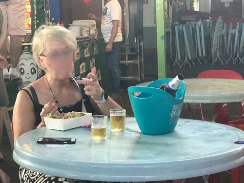 しばらく経つと、隣席に欧米系白人客が着席する。すると、おばさんは満面の笑みで迎える。同じビールの注文だが、白人客にはなんとビールを冷やしておくためのアイスバケツまでサーブされる。われわれに数粒の氷もくれないのに、これは何のことだ。おばさんはさらに満面の笑みで白人客にビールを注ぐ。そんなサービス、われわれには当然ない。