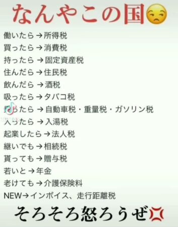 ネットでこんなのが流れている。「なんやこの国、働いたら所得税、買ったら消費税、持ったら固定資産税、住んだら住民税、飲んだら酒税、吸ったらタバコ税、乗ったら自動車税・重量税・ガソリン税、入ったら入湯税、起業したら法人税、継いだら相続税、貰っても贈与税、若いと年金、老けても介護保険料、NEWインボイスや走行距離税、そろそろ怒ろうぜ」