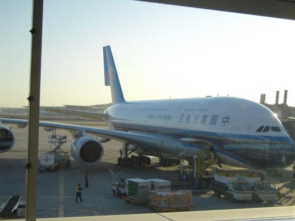 11月23日(水)、北京から広州へ移動する。今回は、あの総2階建ての最新鋭巨大ジャンボ機エアバスA380型機に搭乗する。スペシャル・フライト、便名も特別――中国南方航空CZ3000便。もちろん、中国国内では1号機、しかもOnly One。