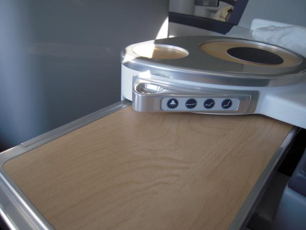 肝心の座席はやや硬め。離着陸時に、一応正常ポジションに戻すようにCAがリマインドするが、フラットにならない限り、少々倒してもまったく注意されない。座席のコントロールは、移動テーブルの上部、右肘かけの先端部、つまり位置的にちょうど右手の置く場所にあるので、とても使いやすい。もちろん、座席は完全フラットになり、ベッド代わりに使うことも可能だ。