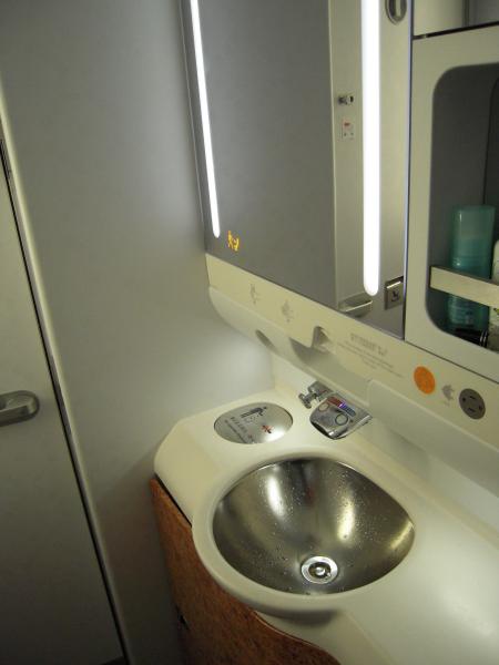 ジャケットをCAに預けて荷物を収納すると、さっそく機内探検が始まる。スペースは全体的に他機よりやや広め。機内照明はおそらく低電力のLED仕様で、デザインも洗練されているし、おしゃれだ。トイレの中はとにかく広いし、木目の紋様が高級感を出している。水道の蛇口はセンサー式。