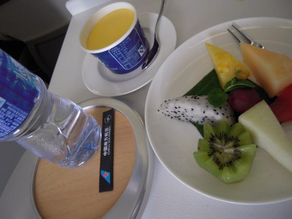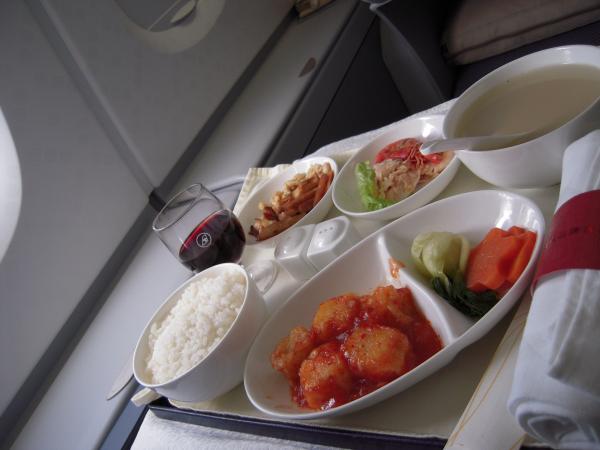食事は中国系キャリアの機内食にしてはまあまあ、悪くない。ビーフ、魚とチキンの3種類からチョイス。私が選んだのは、鱈の四川風チリソース。前菜は海老、ラー油風味ピリ辛鶏肉、胡桃と筍の酢漬け、スープはやや濃厚な鶏スープ、そして、ご飯。食後は、フルーツと国産アイスクリーム。