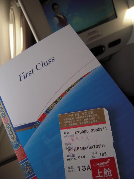 私が予約していたファーストクラスはアッパーデッキ(2階)にあり、窓側席の13Aを無事確保できた。チェックインを終え、南方航空のラウンジで軽く朝食を済ませると、早々と搭乗口へと向かう。