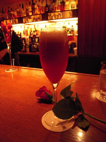 勧めてくれたのは、ドンペリニヨン・ベースのカクテル。ドンペリをフレッシュで濃厚な苺ジュースで割ったカクテル。きりりとしたダーク・ワインレッドはまさにバラの赤にそっくりだ。