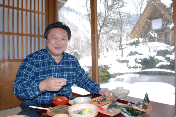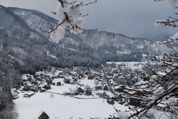桜が咲き始める山代温泉から車で1時間ほど走ると、そこは、一面白銀の世界。4月上旬といえば、桜前線しか頭にない私は思わず嬉しい悲鳴を上げる。パンフレットに載っているあの雪の白川郷は、そのまま目の前に広がっている。