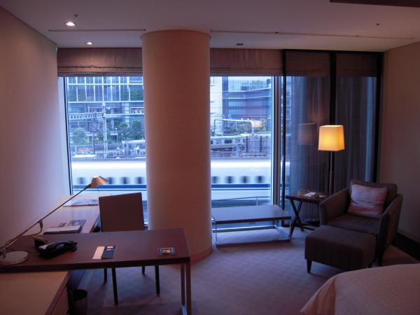 はじめて泊まるこのホテルは、まさに「鉄ちゃん」が嬉しい悲鳴を上げる場所だ。東京駅側のレールビュー客室の大きな窓からは新幹線をはじめ、在来線がひっきりなしに行き来する、日本一列車の運行が多い東京駅の線路が目前に見えるのである。事前にリクエストしておいた低層階の3階にある客室から見える新幹線の迫力が凄い。