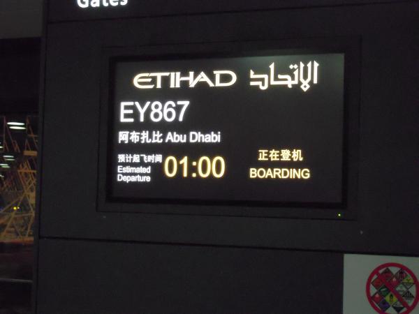 8月10日午前1時出発予定のエティハド航空EY867便アブダビ行きは1時間10分遅れて、未明2時過ぎに浦東空港を飛び立った。