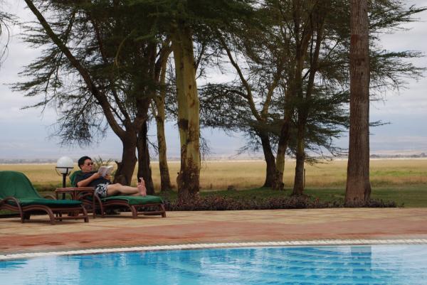 朝食が終わると、プールサイドで読書。サバンナの中のプールは誠に贅沢だ。とはいっても寒いので泳げるわけではない。サバンナの場合、一日の温度差が大きく、昼ごろからは半袖Tシャツになる。午後には、プールに飛び込む欧米人も現れる。