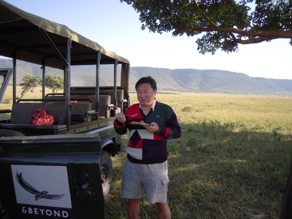 長時間なので、朝食はサバンナでのピクニックになる。6時半に出発して、一通りサファリを回って、9時過ぎになると、そろそろお腹も空きだす。いや、それよりもトイレに行きたい。出発前にモーニングコールでテントに届けられたコーヒーをがぶ飲みした私は、いよいよ我慢の限界だ。