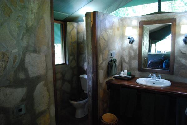 私たちが泊まる37番テントは、ロビー棟から山道を延々と歩くこと8~10分、メインのテント群から離れた敷地の端にある。環境は抜群。テント前の小道は専用で、他の客が通ることがなく、周りは森に囲まれている。小鳥のさえずりはもちろんのこと、サバンナを一望し、移動中のアフリカゾウを眺めるほか、近くまでバッファローがやってきたり、さらにイボイノシシや鹿がテントのすぐ前に草を求めて訪問してきたりする。