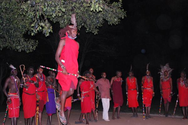 夕方のゲームドライブからキャンプに戻ってくると、周りはすでに暗くなっていた。キャンプファイヤーを囲んで、ジントニックでも飲みながら、マサイダンスのショーを楽しむ。