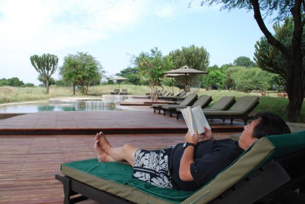 朝食後は、プールサイドで読書。そばには時々イボイノシシの親子が訪ねてきたりする。