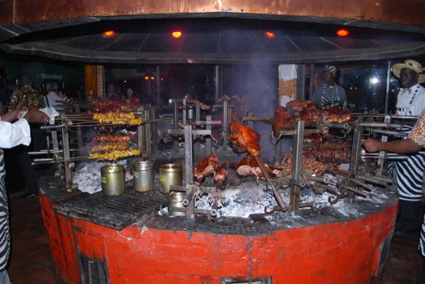 炭焼き台のスケールは圧巻。テーブルまで肉の塊を運んできて目の前でカットしてくれる。通常の牛肉や鶏肉、ターキー以外にワニやダチョウなどの肉もサーブされる。食べ放題制、お腹がいっぱいになるまで何回お変わりしても自由・・・