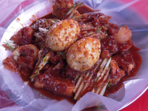 「ロジャック」とはマレー語でごちゃまぜの意味。厚揚げ豆腐、揚げパン、ゆで卵のようなものがトロトロソースでごちゃまぜになっている。濃厚なソースは甘塩っぱベースで、なかにココナッツフレーバーが効いていてこれも複雑な味のミックスだ。
