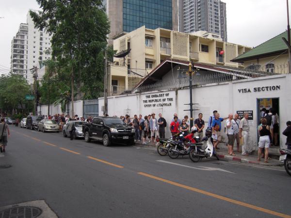 早朝から、バンコクのミャンマー大使館前にビザ申請者の長蛇の列