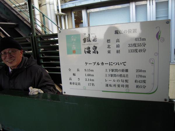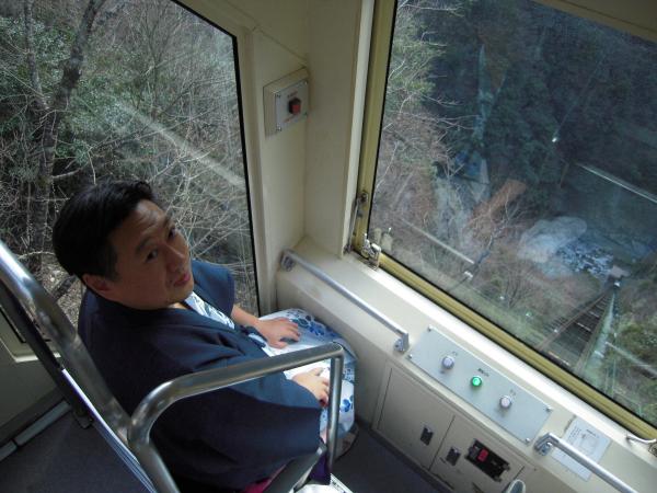 この宿の名物は何といっても、谷底にある露天風呂。専用ケーブルカーでアクセスし、約170メートル下の露天風呂までは約5分、傾斜角42度の断崖をゆっくりと大パノラマの景色を一望しながら下っていく。