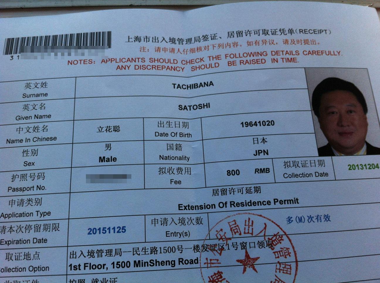 2年以上の居留ビザの場合、本人出頭が必要でしかもカウンターで顔写真を撮られる・・・。で、パスポートを預けたため、預かり証をもって飛行機に乗ったり、ホテルに宿泊したりすることになる。