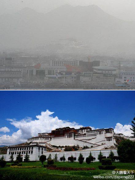 いよいよ空気汚染がチベットまでか、12月19日頃のラサ・ポタラ宮(上)と通常時(下)の比較(中国ブログ・微博)