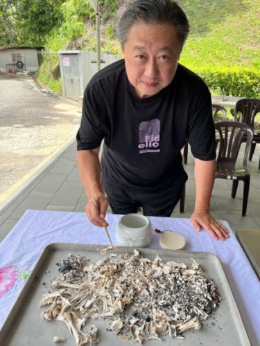 拾骨。白く残った骨を、一つひとつ箸で拾い上げる。14年7か月の時間が、この小さな形になっている。重さは軽いのに、意味は重い。静かに骨壺へ納めた。