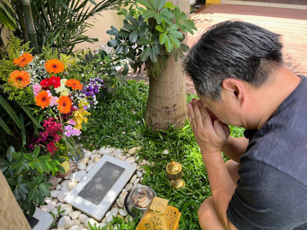 2026年3月11日。庭は静かだった。昼下がりの光が熱帯の空気の中でゆっくりと落ちている。草はいつもより少し濃い緑に見え、白い小石の上に置かれた墓石の周りだけが、整然とした小さな空間をつくっていた。ここに長男ゴン太が眠っている。二年前の今日、彼はこの世を去った。