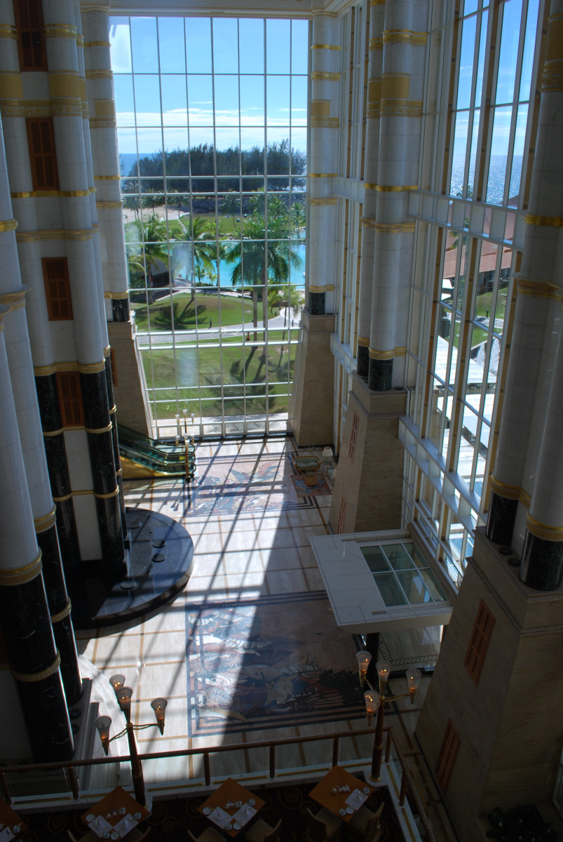 一歩ロビーに踏み入れると、圧巻。金、金、金、大理石、大理石、大理石・・・、そして紺碧の海を眼下に納める巨大なアトリウム。