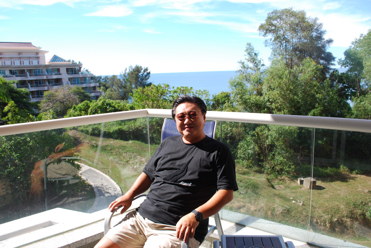 一般の客室の天井がここまで高いのも初めて見た。それに大きなバルコニー、これも「く」の字になっていてミニパーティーができるほどの広さ。もちろん、海一望。