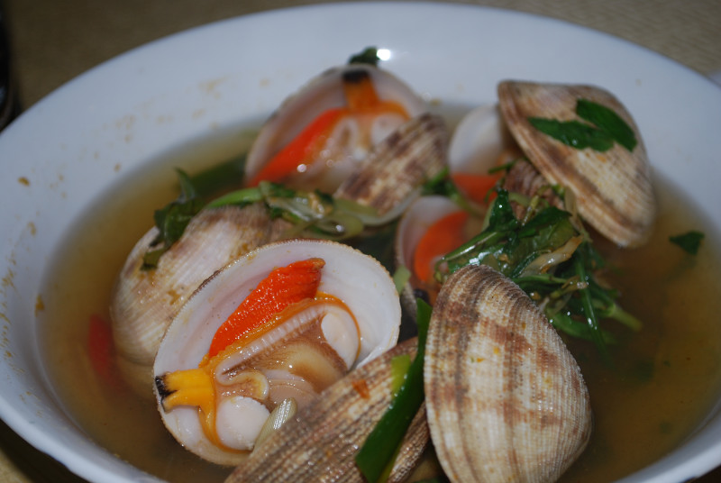 大きな貝。何の貝だろう。名は知らない。ベトナム語で説明されても分からない。外見は少し赤貝っぽいが、開いたら巨大はまぐり。蒸しのスープはもう絶品。