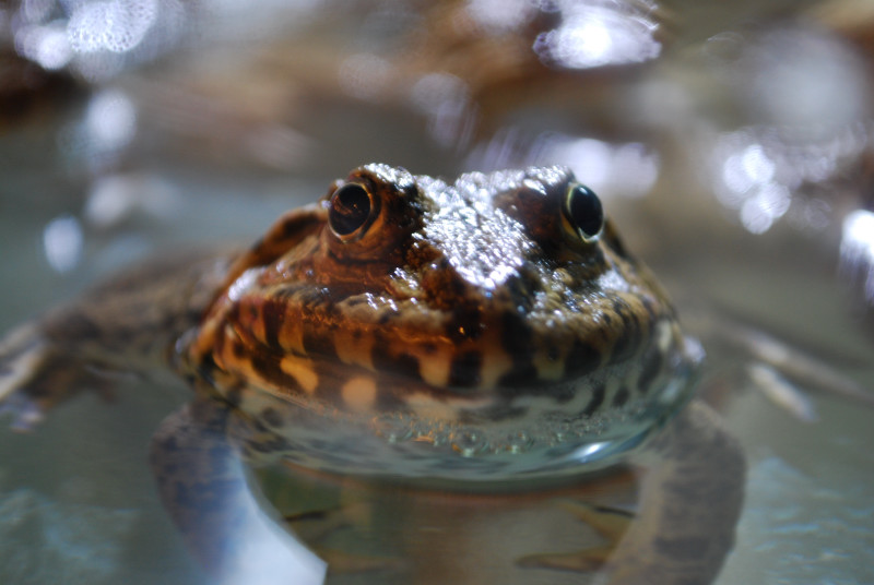 こんな目つきで見つめられたら、絶対に食べられない。水槽中の蛙ちゃんは掌のほど大きい。蛙は食べないが、ほかは腹いっぱい食べたい。