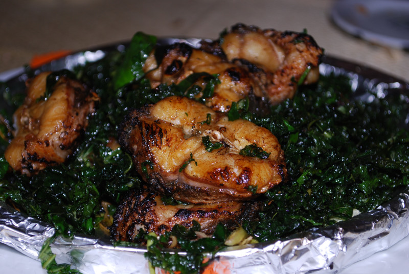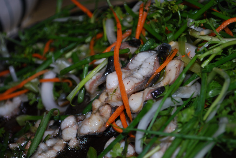 何と言っても、これ、巨大ウナギ。もちろん水槽から、活・・・。身長1.2~1.3メートルほどある。丸一匹の半分はグリル、半分は蒸し。グリルの方は白焼き状態で上品な淡白さに程よい油が乗っていて美味。蒸しはどさっとハーブ類が入っていてそのコンビは最高。
