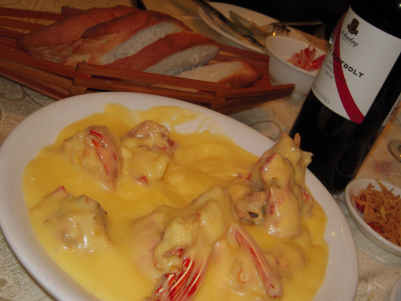 竹園といえば、あの名物料理・ロブスターのチーズ焼き。知る人ぞ知る逸品である。久しぶりに竹園で夕食。例によってワトソンのワインショップで赤ワインを買って持ち込む。ワインの持ち込みは自由という嬉しい制度も、竹園ならではの太っ腹さ。