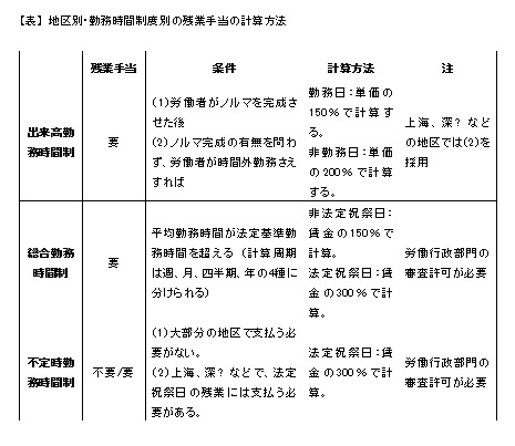 残業時間に対して会社あるいは従業員のどちらが立証するかは、実際には見解の違いがあり、地方によって対応が異なっている。不定時勤務時間制の従業員に対して、会社は残業手当を支払う必要がない。 【事例】 …